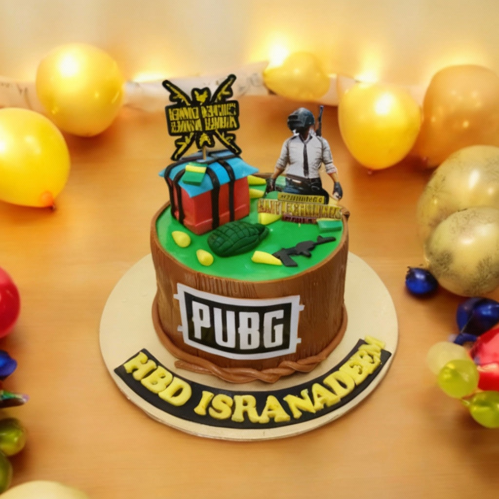 This captivating birthday cake is a true celebration of the gamer's spirit, showcasing a vibrant and immersive design that encompasses a variety of beloved video game franchises. The cake's foundation is adorned with the iconic logos of popular gaming titles, including PUBG, Freefire, Minecraft, and Call Of Duty, creating a visually striking and instantly recognizable backdrop.