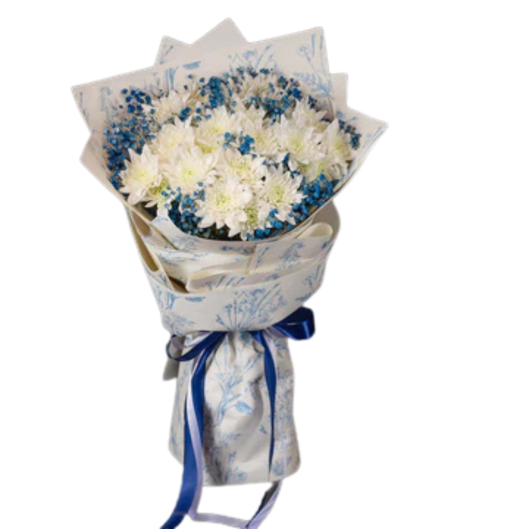The Blue & White Chrysanthemum Bouquet with Baby's Breath is a beautiful and fresh arrangement, combining the purity of white chrysanthemums with the striking contrast of blue baby’s breath. Wrapped in elegant blue floral-patterned paper and finished with a blue satin ribbon, this bouquet is perfect for expressing love, appreciation, or celebrating special moments.