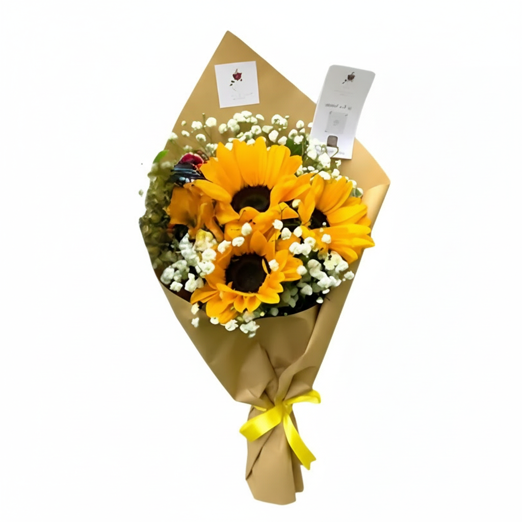 This vibrant and cheerful bouquet is a true celebration of summer's warmth and beauty. Featuring a stunning arrangement of vibrant sunflowers, delicate baby's breath, and a captivating red butterfly, this bouquet is a sight to behold. The sunflowers, with their large, golden heads and lush green stems, take center stage, radiating a sense of joy and optimism. The baby's breath adds a delicate and airy touch, complementing the sunflowers' bold presence. The addition of the red butterfly, perched atop the arrangement, adds a touch of whimsy and wonder, creating a truly enchanting display. Whether gifting this bouquet to a loved one or treating yourself, it is sure to bring a smile to the recipient's face. The Sunflower Delight Bouquet is a perfect choice for any occasion, from birthdays and anniversaries to just because. Its vibrant colors and natural beauty will brighten any space and uplift the spirits of all who behold it. At just PKR 2,499, this bouquet offers exceptional value, making it a wonderful and affordable way to express your affection or appreciation. Surprise someone special or add a touch of sunshine to your own day with the Sunflower Delight Bouquet. Alt Text: A vibrant bouquet featuring large, golden sunflowers, delicate baby's breath, and a captivating red butterfly, creating a cheerful and enchanting display.
